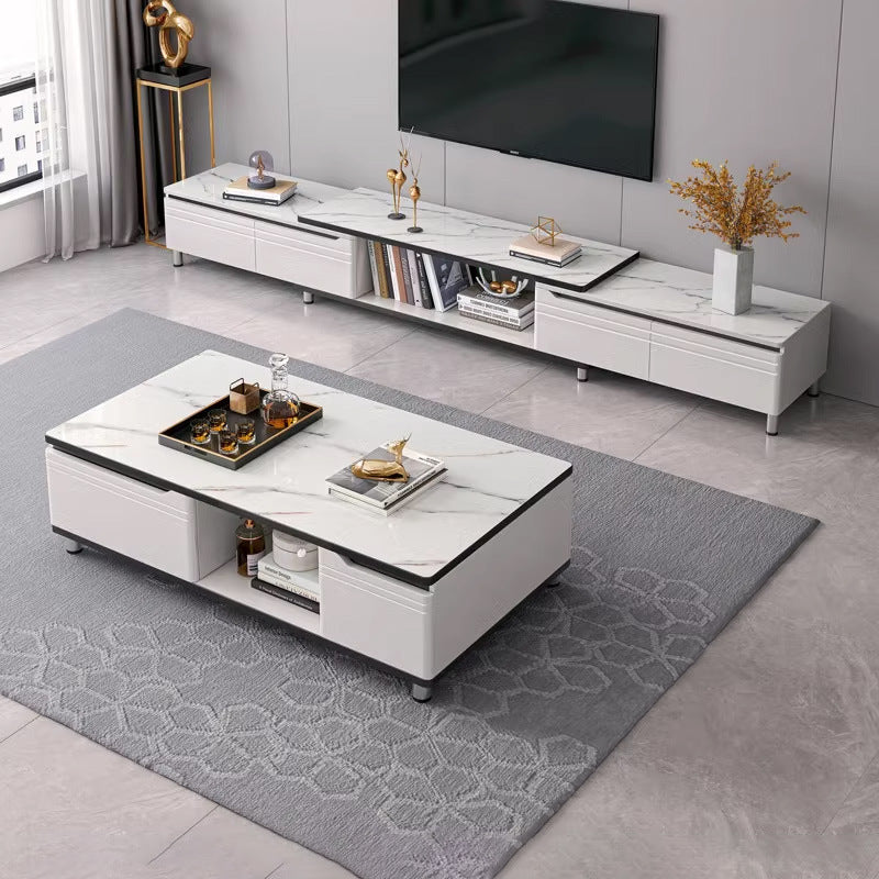 The TV stand features a marble-patterned finish, offering a sleek, luxurious look while providing ample storage for electronics, media, and decorative items. The large-sized wall-attached extendable side table allows flexible use, providing additional surface space for serving, display, or working without taking up permanent floor space.
